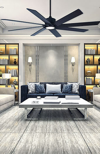 Professional installation of new ceiling fans in bedrooms, living rooms, patios, and offices with options for standard, modern low-profile designs and custom mounting heights.